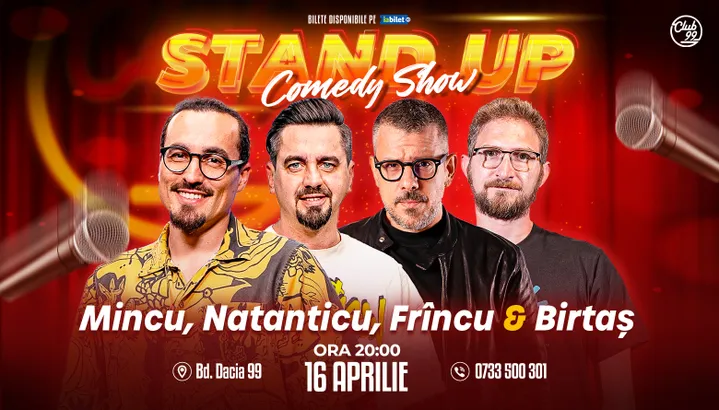 Vă așteptăm la o seară de stand-up comedy alături de Raul Gheba, Natanticu, Tudor Costina & Mincu